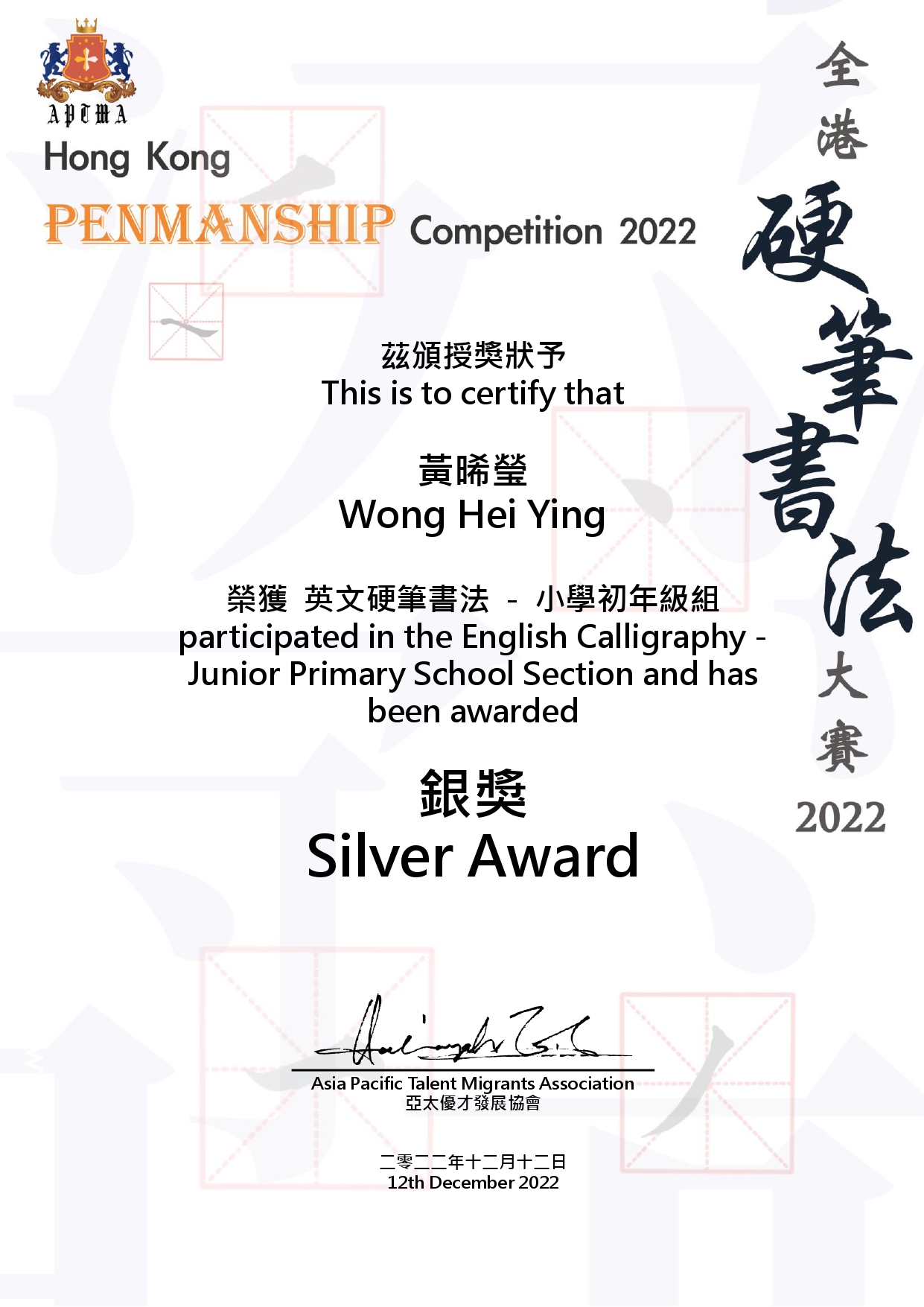 1A_黃晞瑩_全港硬筆書法大賽_小學初年級組_銀獎