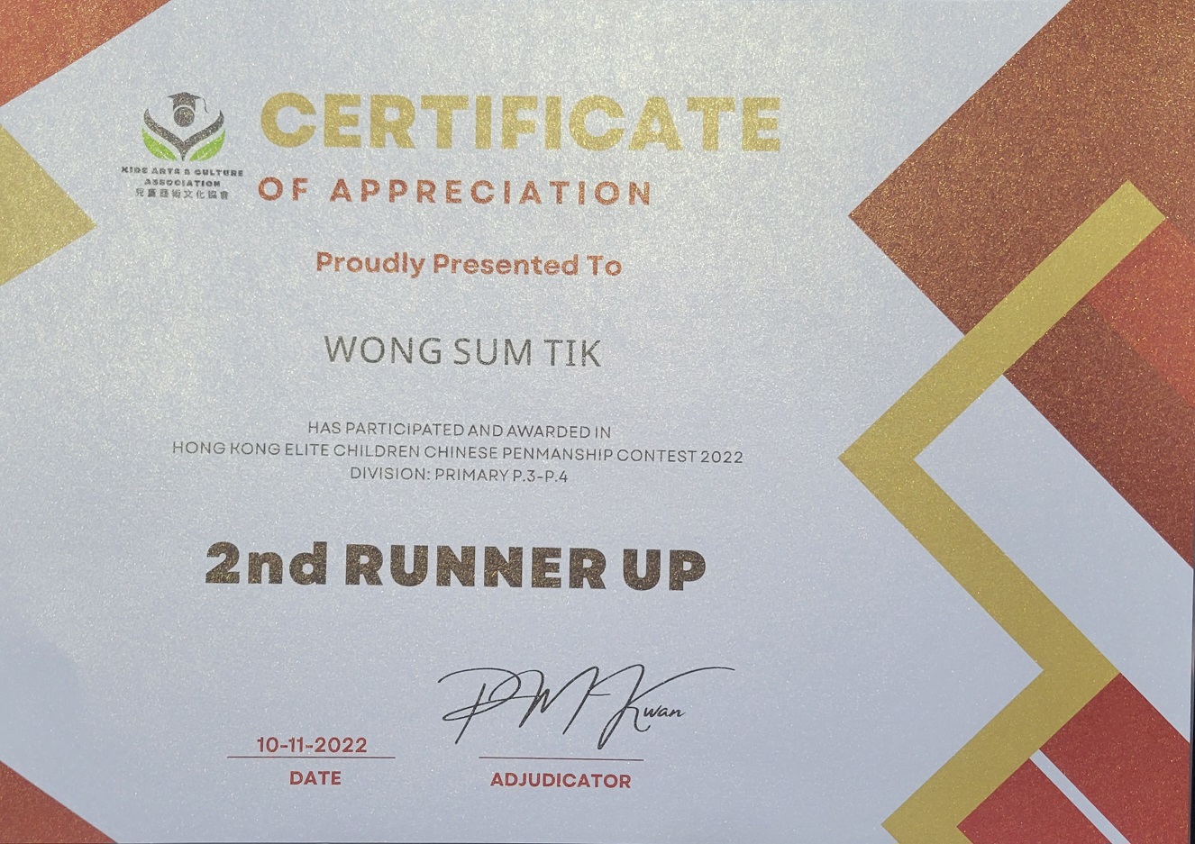 全港精英兒童硬筆書法比賽 2022 | 4A_黃琛迪 |