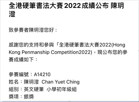 1C_陳玥澄_全港硬筆書法大賽2022_英文硬筆 小學初年級組_銀獎