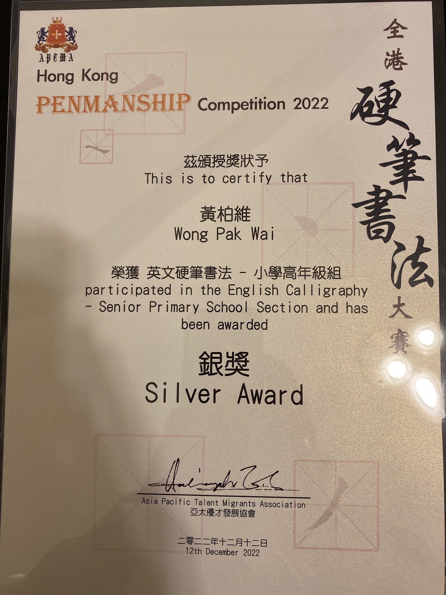 4C_黃柏維_全港硬筆書法大賽2022_英文硬筆 小學高年級組_銀獎