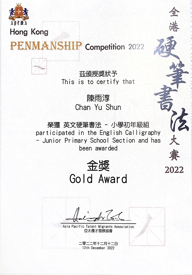 1A_陳雨淳_全港硬筆書法大賽(英文)2022_小學初年級組_金獎