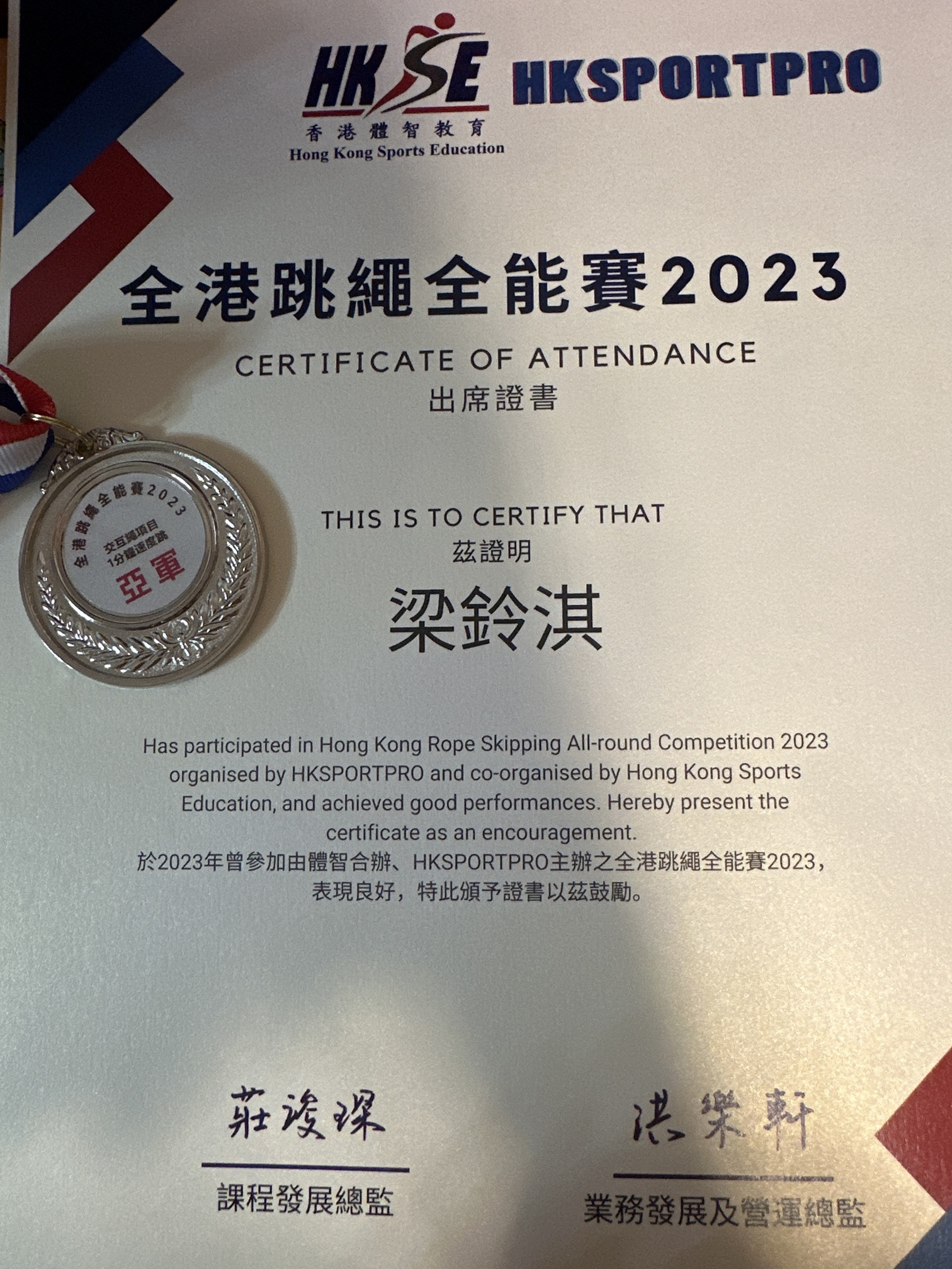 4B_梁鈴淇_全港跳繩全能賽2023年_交互繩項目 1分鐘速度跳_亞軍