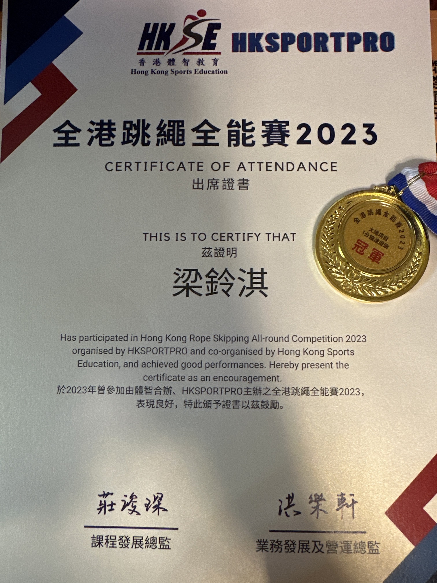 4B_梁鈴淇_全港跳繩全能賽2023年_大繩項目 1分鐘速度跳_冠軍