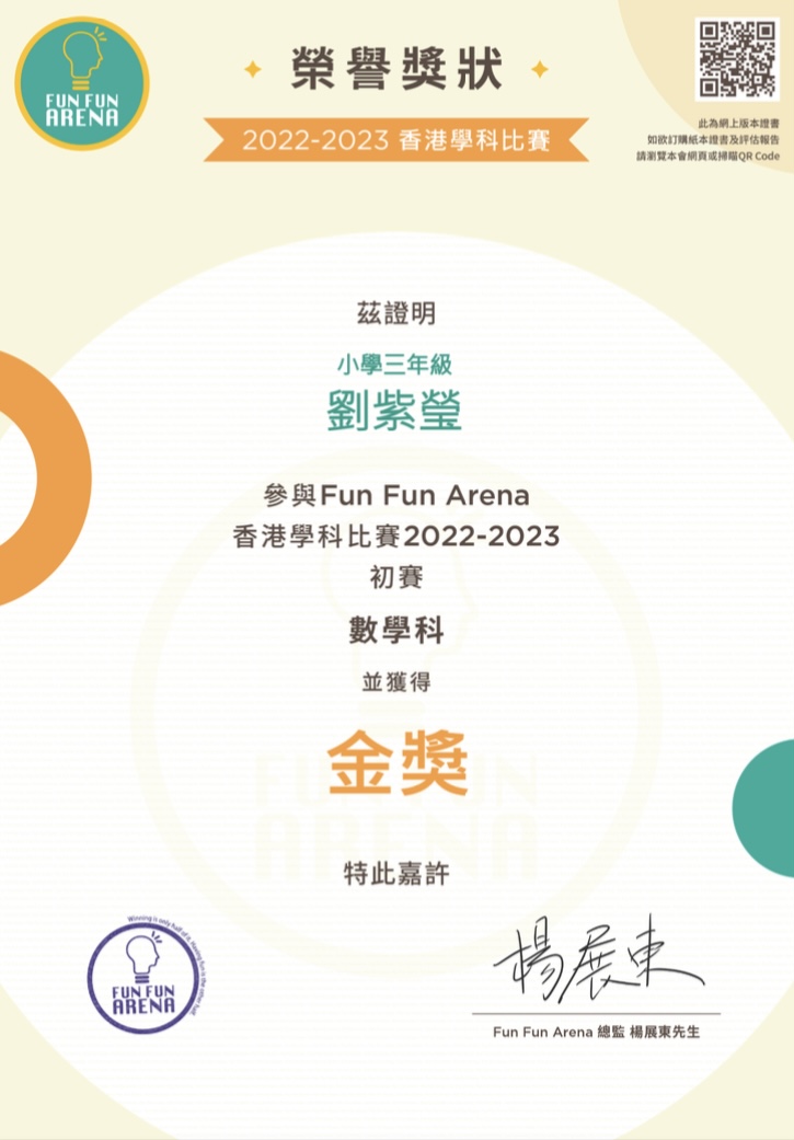 3B_劉紫瑩_香港學科比賽2022-2023(初賽) 數學科_小學三年級_金獎