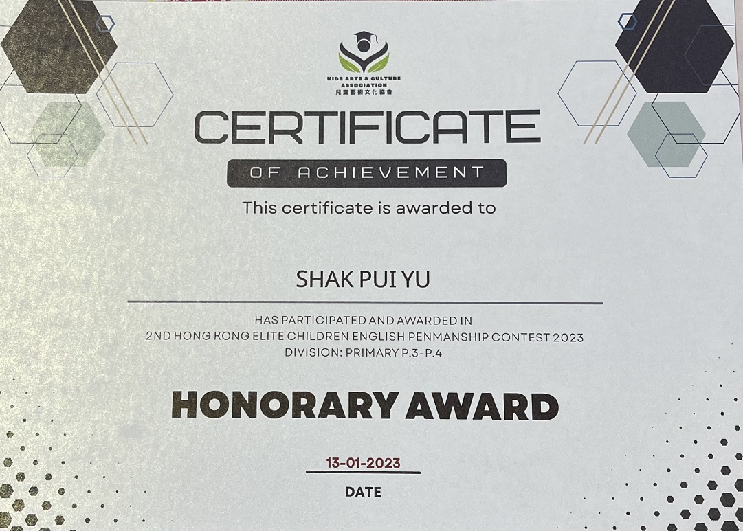 4A_石沛榆_第二屆全港精英兒童書法比賽 2023 _英文硬筆書法 - 小學三至四年級組_榮譽奬